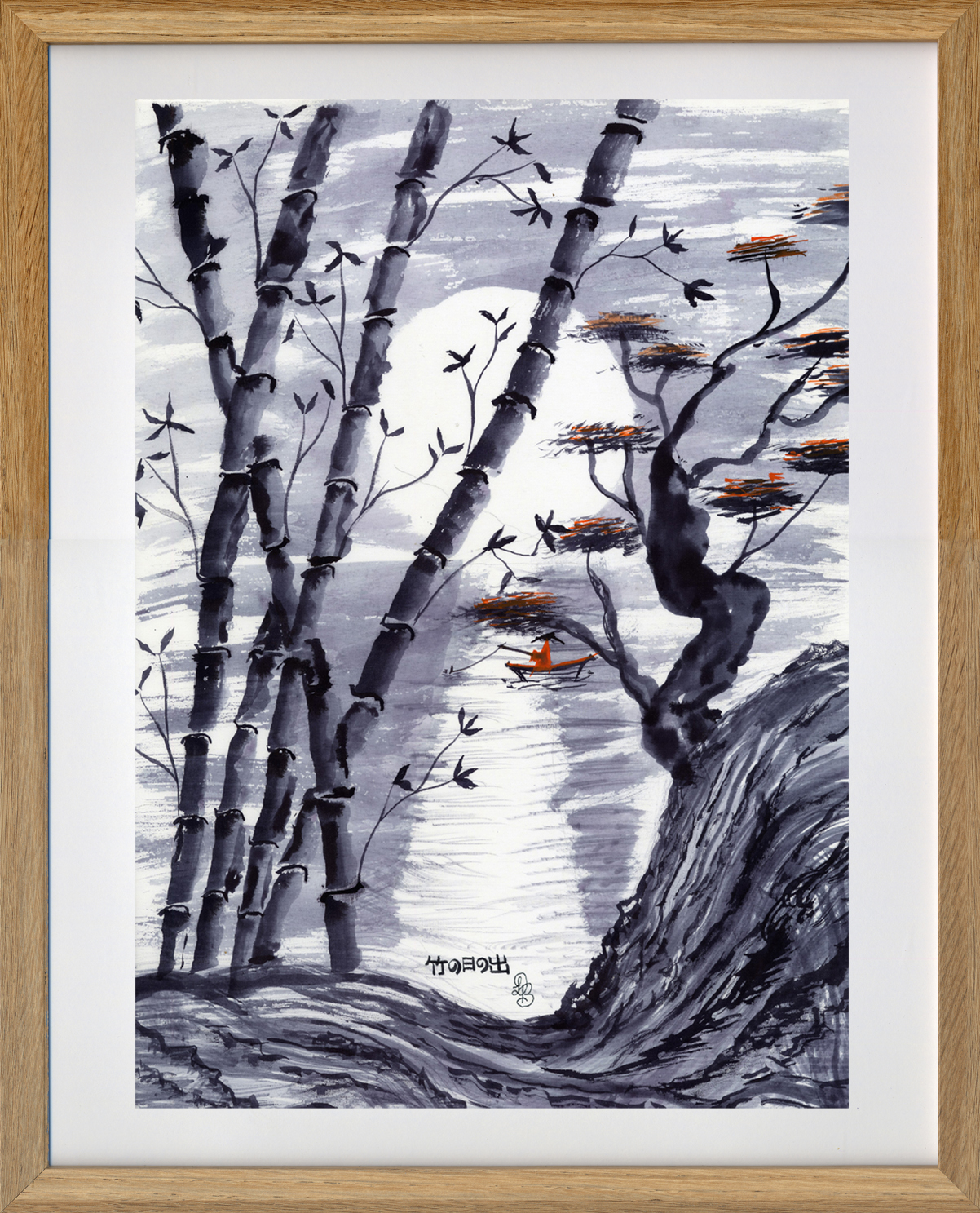 麻布に日本の筆で黒墨、ところどころに赤墨で描かれています。お部屋に安らぎと調和をもたらすことを意図しています。