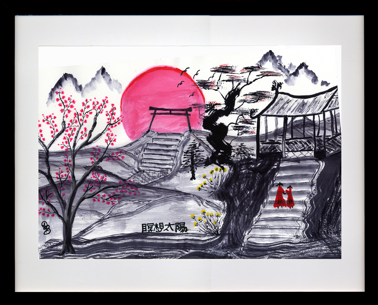 リネンの布に、日本の筆で黒の墨と赤い墨で描かれています。部屋に平和と調和をもたらすことを意図しています。