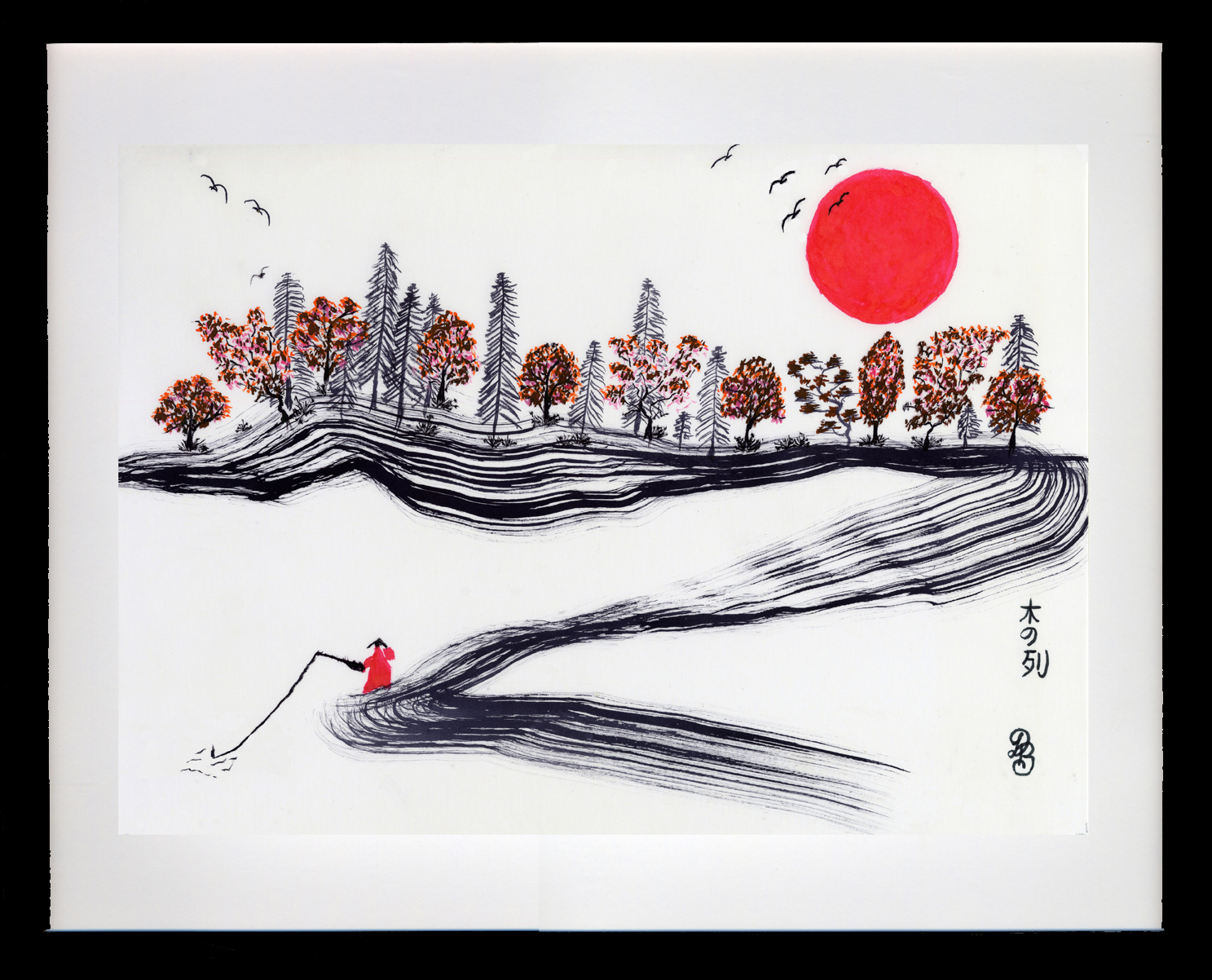 麻布に黒の墨と赤い墨で和筆で描かれています。室内に平和と調和をもたらすことを意図しています。