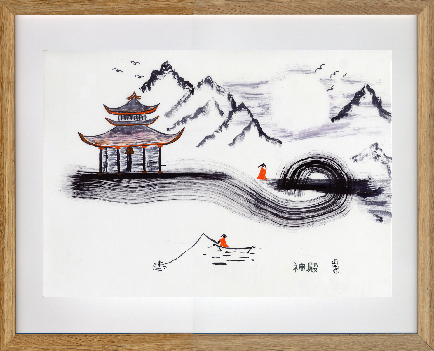 麻布に日本の筆で黒墨で描かれ、ところどころに赤墨が散りばめられています。室内に平和と調和をもたらすことを意図しています。