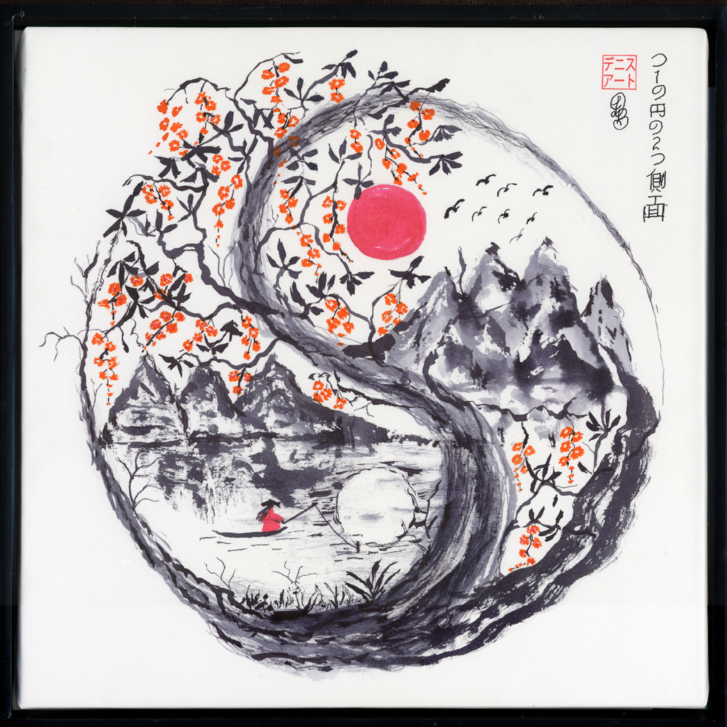 麻布に日本の筆で黒墨で描かれ、ところどころに赤墨が散りばめられ、浮き彫りの額縁に収められています。空間に安らぎと調和をもたらすことを意図しています。